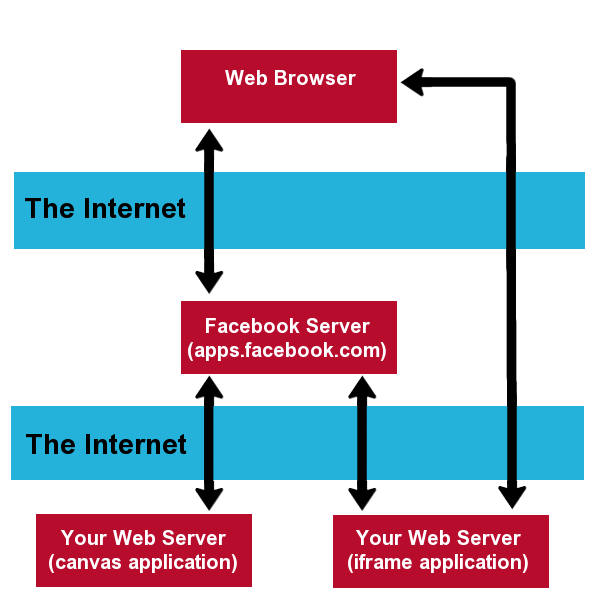 An "iframe application" is a Facebook application that relies upon HTML's "iframe" element to display itself. This HTML element allows one page to be easily embedded in another. The web browser fetches both the original page and the embedded page directly, and treats them more or less as completely separate things. This is reflected by the arrows in the diagram, which show the web browser communicating directly with both Facebook and our own site.In an iframe application, Facebook's web site outputs an iframe element that refers to your site. After that, the user's browser communicates directly with your web site.